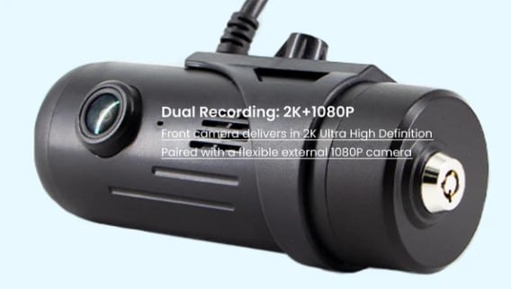 The front camera records in 2K Ultra High Definition and is complemented by a flexible 1080p external camera for versatile positioning.