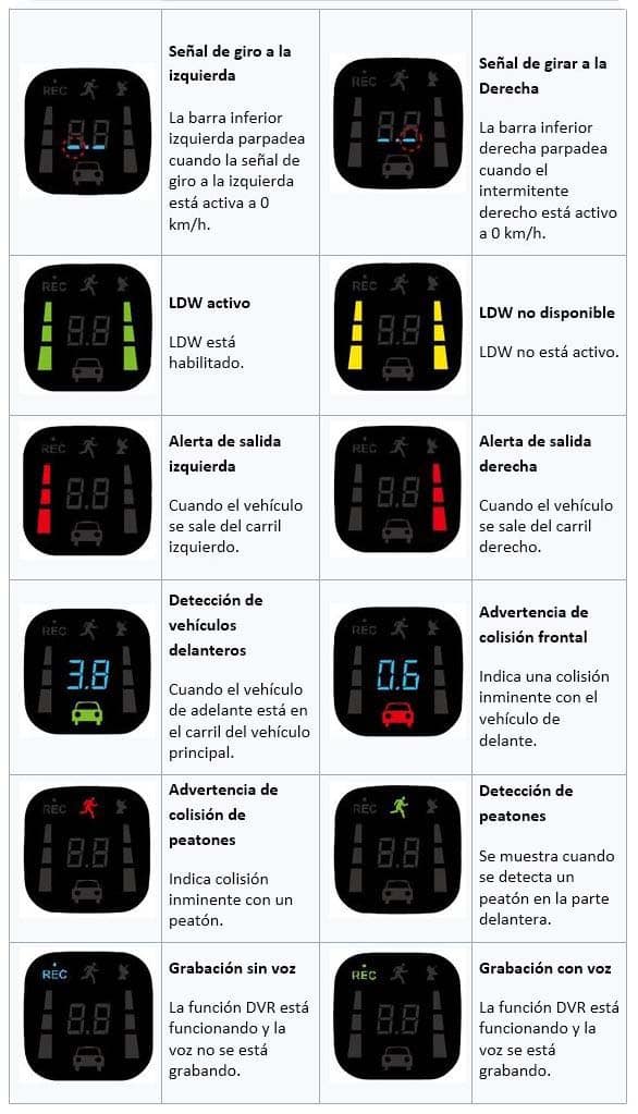 El conductor recibirá notificaciones visuales a través de la pantalla (FCW, LDW, PCW, FVSA, FPW, SLR).