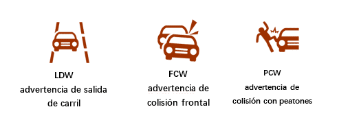 • LDW (advertencia por salida de carril): Ayuda a recuperar la dirección si el conductor se sale involuntariamente de su carril.