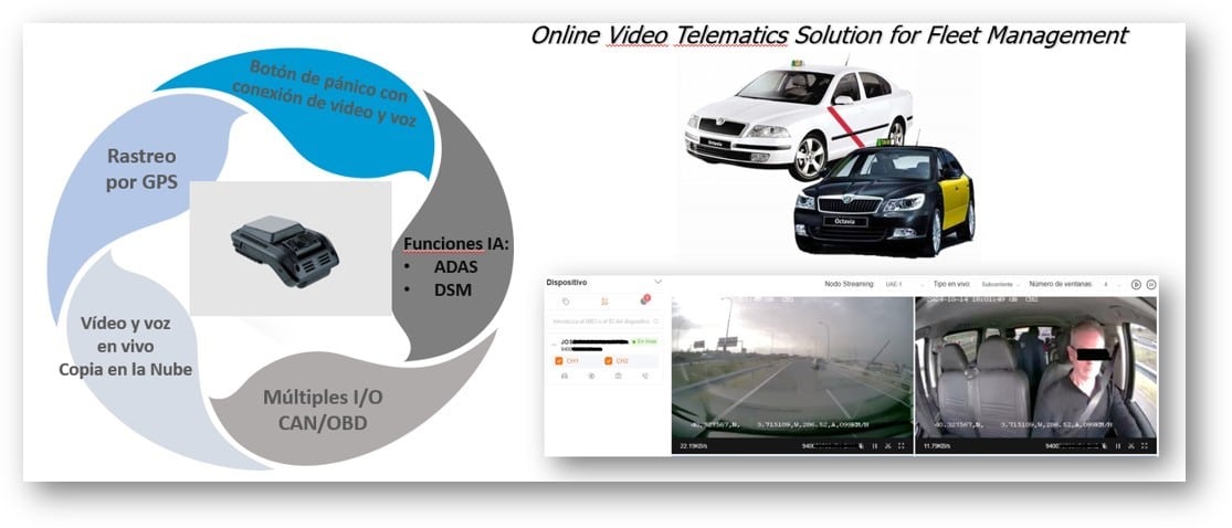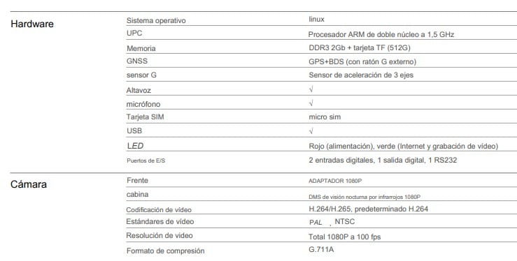 - Modelo on-line con SIM: 12 meses de servicio con conexión de datos con seguimiento GPS, Video en tiempo real desde APP y Plataforma Web, alertas en tiempo real ADAS/DSM y emergencias por botón SOS con video y voz bidireccional. El servicio ofertado incluye 12 meses de licencia de uso de la plataforma/servidor y SIM de datos con capacidad de 10GB por mes.