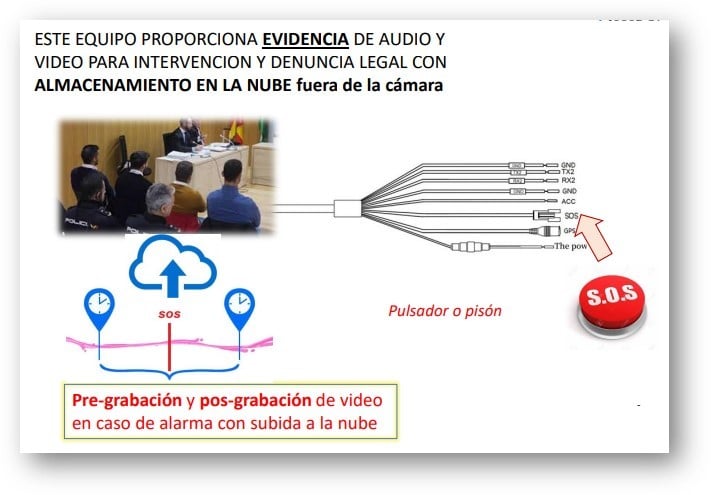 En caso de activarse el pulsador emergencia SOS, las grabaciones con pre-post grabación suben automáticamente al servidor Cloud. De esta forma, si el delincuente se llevara la cámara, las grabaciones previas estarían seguras en la nube.