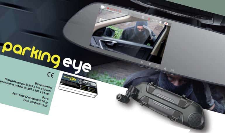 La cámara delantera y trasera antivandalismo Parking Eye permite llevar a cabo tareas de grabación completas en un vehículo tanto en modo ruta como en vigilancia del coche aparcado. El Parking Eye equipa un exclusivo sistema de detección de movimiento por sensores de microondas que vigila un perímetro de 5-7 metros alrededor del vehículo,  para que no se escape ningún movimiento alrededor del vehículo. Además dispone de todas las funciones avanzadas de una Dashcam permitiendo grabar las rutas en alta definición, disponer de pruebas en caso de accidente, o de gran ayuda en maniobras de marcha atrás con poca visibilidad con la opción de camara trasera.
