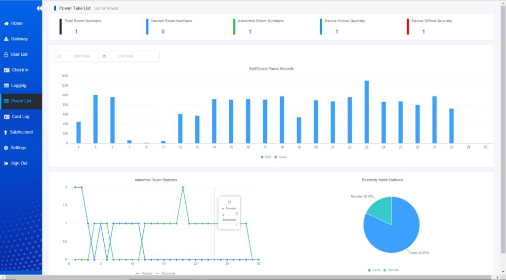 Las características de check-in incluyen, re emisión de la tarjeta o código de apertura de la habitación, encendido o apagado remoto (si está equipado con interruptor de encendido), habitación en mantenimiento, habitación vacía, modo normalmente abierto y bloqueo de puerta, descarga de código QR, etc.